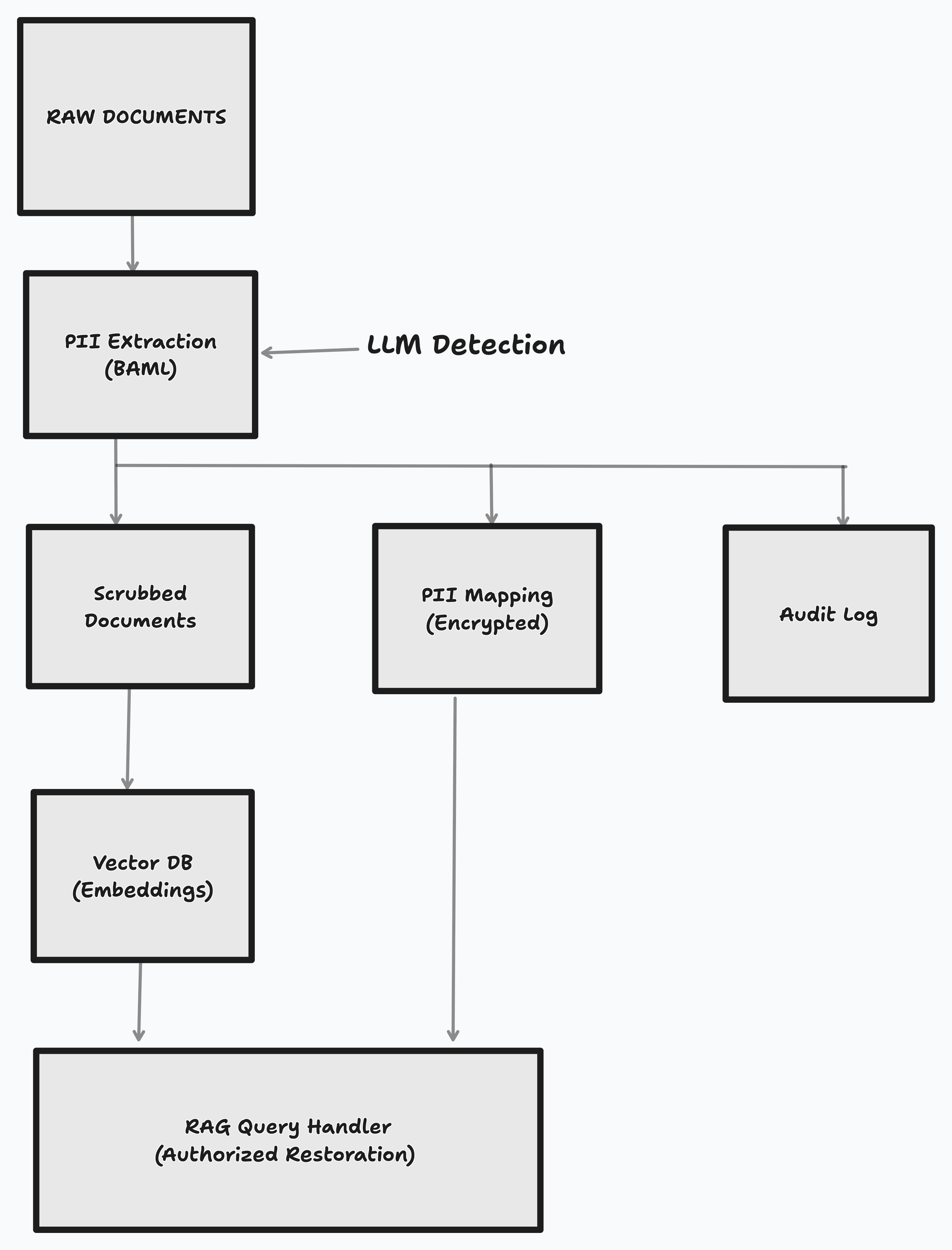 The solution is a clean PII extraction and scrubbing pipeline in the ingestion step. It strips sensitive data before ingestion, keeps a secure mapping, and restores it when needed.